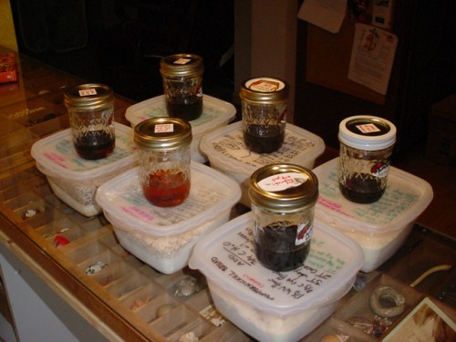 The only flaw in that plan was stickiness. Molasses, oil, honey, lecithin and malt syrups have a way of leaving little stickies all over the kitchen, fingers, and the chins of my little spoon-lickers. So today, I measured the oily/sticky stuff into little labeled jam jars, one to match each box. All that’s required now is water and yeast. And a monday tag for mom, reminding me to refill the bread boxes.
