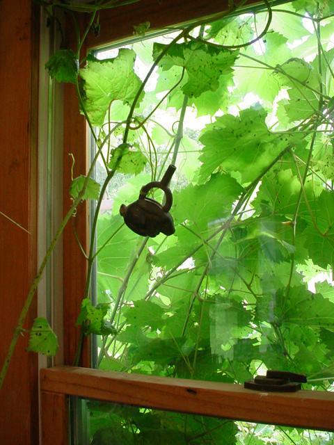 (The photo: a grape vine climbed in my open window and selected a little pit-fired stirrup vessel sitting on the sill. When I had to close the window against the September chill, it held on.)