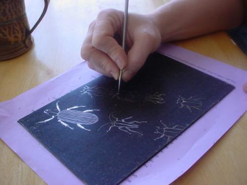 When I went back to class, I showed the prof my sketch for the etching I am planning (rows of beetles on pins, as in the old collections) and he thought that was fine. Then (with some misgivings) I pulled out my woodcut. He looked it over carefully before handing it back and saying, “You know, you can flip this over and start the new one on the back…”