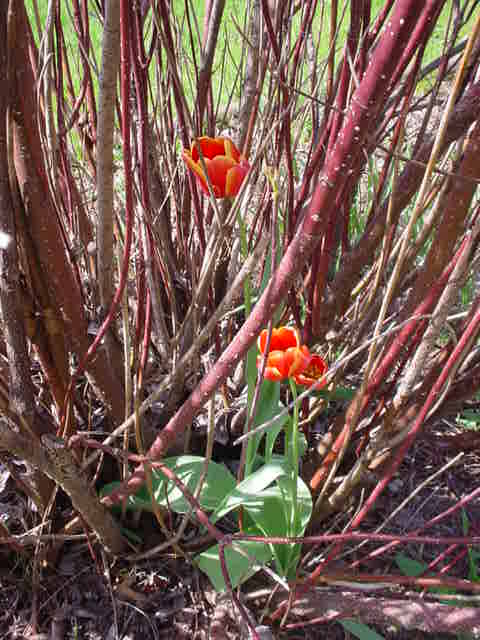 About 16 years ago when we bought this house, we took out a chain link fence that ran across the front of the yard, and I planted a quince and a red twig dogwood out there. Later we discovered that the old lady who had lived (and died) here had planted red tulips all along that chain link fence. They remember her, and come up every year. Mostly they don’t get to bloom before Jeff mows for the first time, but these girls somehow ended up near the dogwood I planted, and have managed to bloom every year.