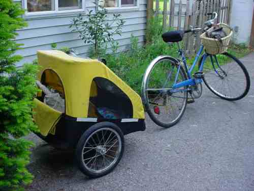 I went up in the garage loft and pulled down the old bike trailer I used to use for toddlers. Now I use it for groceries, clay tools, packages for the post office and general shopping trips.