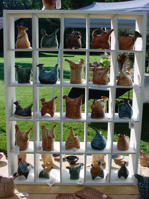 The best part is always the company, a group of potters sitting at a table in the shade eating good food and talking shop. I feel a little like a gypsy with a traveling road show; out of my van come tables, shelves, fabrics, boxes of pots and an ez-up tent… and eight hours later, back in it all goes.