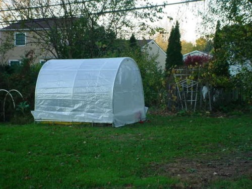 My old homemade hoop house was made of PVC and a heavy duty plastic tarp left over from a university art installation, but when it finally succumbed to a windstorm, I discovered that I couldn’t rebuild it very cheaply if I had to buy the plastic myself. This clearance sale one was a better deal. The old screen door from the former hoop house is now on my chicken coop.