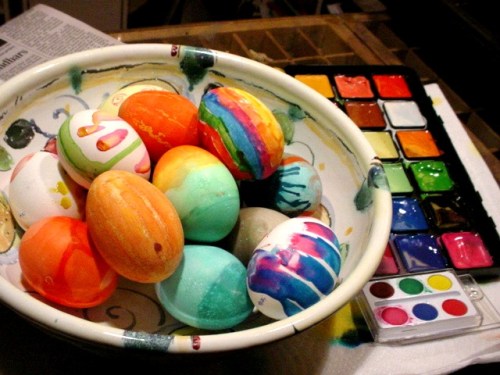 Tonight we colored eggs, as is our usual custom. As I dipped and smudged, waxed and brushed, my head was full of bright majolicas, Russel Fouts’ smoky surfaces, the shiny little jewels in the Artstream trailer, Liz Willoughby’s carbon trap shino glaze, Jon Singer’s vivid glaze experiments on eggshell-porcelain. We buy dozens of eggs every year and all five of us jealously guard our numbered portion, unwilling to give up a single perfect white canvas.