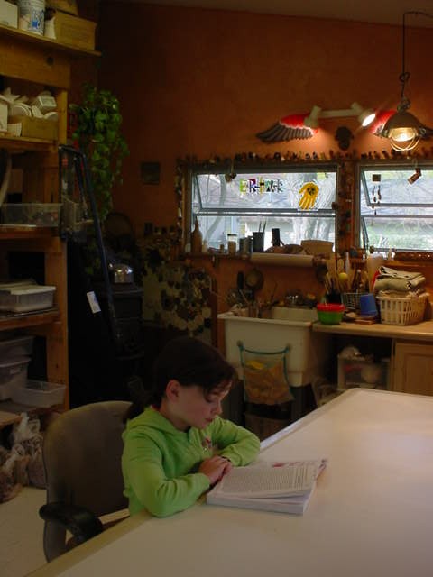 Here’s Molly doing her homeschool homework in my newly cleaned studio…