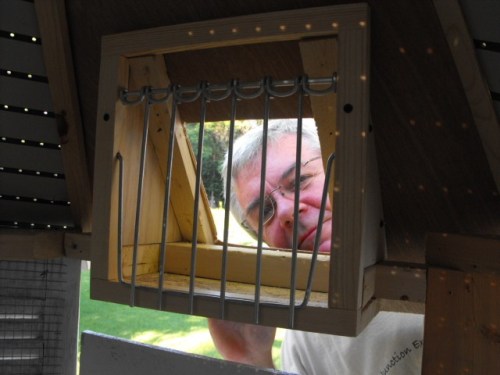 Here’s Jeff coming up to inspect my impressively engineered pigeon door. It can be set to allow the birds to come in, but not be able to leave again.. or it can be set wide open to allow them to go out in the morning. It is strong enough to be cat and ‘coon and possum proof… and it opens onto a landing platform outside, now, with the flap that’s raised becoming its own little dormer roof.