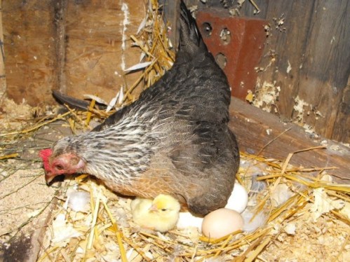 Three of the fancy show bantam eggs we brought home from the Ohio State Fair have hatched under my broody little mama hen, Jennecita. Four more are still eggs, but morning will maybe bring more. That’s happy stuff.