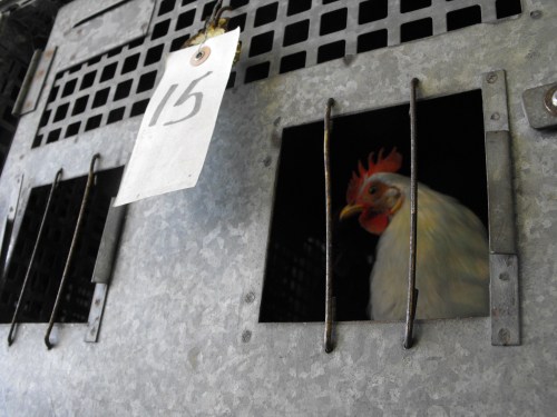 This morning, we drove to Dundee for the saturday auction. Estate stuff, farm implements, a horse trailer full of goats with yellow number stickers on their sides, the auction version of “hello, my name is…” — and a poultry auction house, with battery cages full of hens, rabbits, guinea hens, quail, and lots and lots of roosters.
