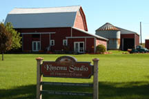 Khnemu farm is a marvelous place, and I have farm envy: Dawn has 30-some acres to myalmost- half acre yard, a whole yard full of chickens to my dozen, a horse and a llama, turkeys and peacocks. The gallery, studio and classroom space are in a restored red barn with hubcaps gleaming on an outside wall. The 1800s farmhouse is solid and charming, original woodwork and “period” decor, with pottery and oriental rugs, and humorous touches everywhere. On my way to bed tonight I spotted the wicked witch of the west’s stripey legs sticking out from under a piece of furniture…