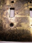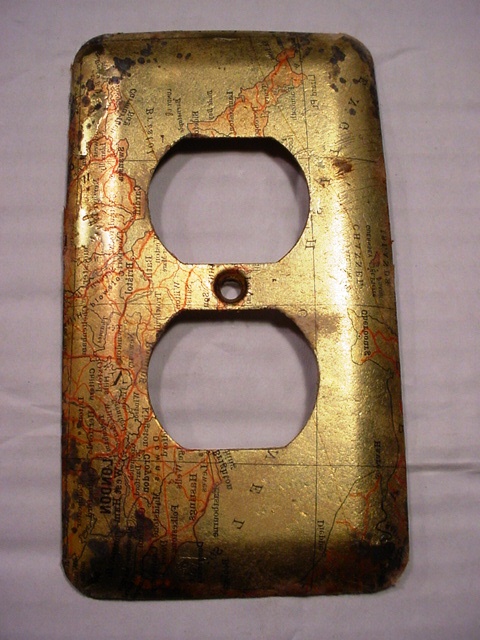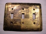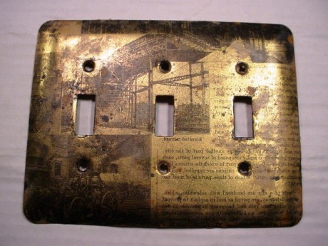 Somewhere in the process of stripping wallpaper, I was peeling layers of modpodged stuff off the switchplates and discovered that the reverse side of some old book pages had printed itself onto the metal. They were perfect, period images, even though they were reversed, so I did some careful sanding and shellacked them to preserve the residual print and corroded looking edges. You can’t tell in