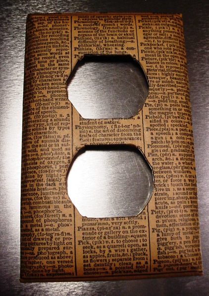 Another outlet cover for the bathroom steampunk project. I used an antique dictionary whose pages are coming unbound.