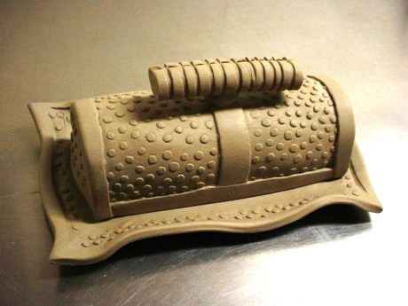 Tonight’s slab project demo. Textured slab laid over a rolling pin for the cover… ends cut to fit. Textured slab base. I just got home from mopping up after the evening class — but it isn’t midnight yet, so it’s still today! I was starting to worry. I painted half the bathroom today and started cleaning up an old steamer trunk to refurbish, but neither of those are at the “ta-daaah!” stage…