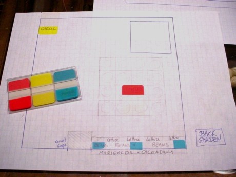 So I made a graph paper garden, one square per foot — hoop house in the back corner, gate in the front. I made copies. One has last year’s plant positions, lest I forget. One will be a spring plan, another hot weather, a third for fall. I am using sticky notes to try out plans (less erasing.)