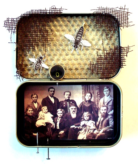 This is a picture of the Dadant family. They have been in the beekeeping business for seven generations now, selling Langstroth hive boxes and bee supplies to beekeepers like me: printed beeswax comb foundation, screened boxes full of bees, wood and nails to build lightweight frames. I’ve been worrying over bees lately, so I made this little homage in an Altoid tin. I call it “Foundations”.
