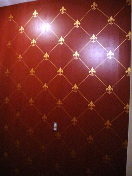 In the photo, the paint behind the stencil looks really shiny but that’s weird light reflection — it’s actually satin paint. The metallic paint I chose for the stencil is the kind that’s bright and shiny straight on but disappears with oblique light, so it changes as you move around the room. Tomorrow I hope to move the steamer trunk in there. The bathroom stuff has been living in the hallway and it’s annoying…