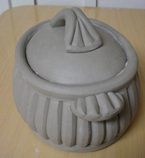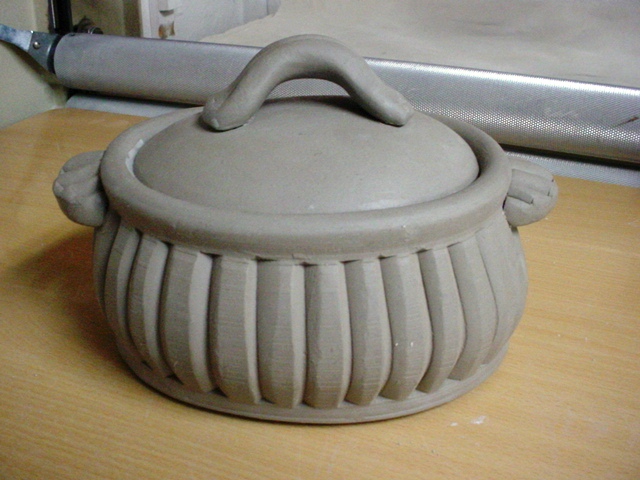 This is made from an extruded wall (I cut the die with a rim and gallery) — textured with a wooden block from a jenga game. A slab floor is added, then a slab slumped inside the rim as a lid (later turned over and trimmed to fit.) I really did make this on the 10th but by the time I got home from teaching/cleaning up after my evening guild class it was midnight.