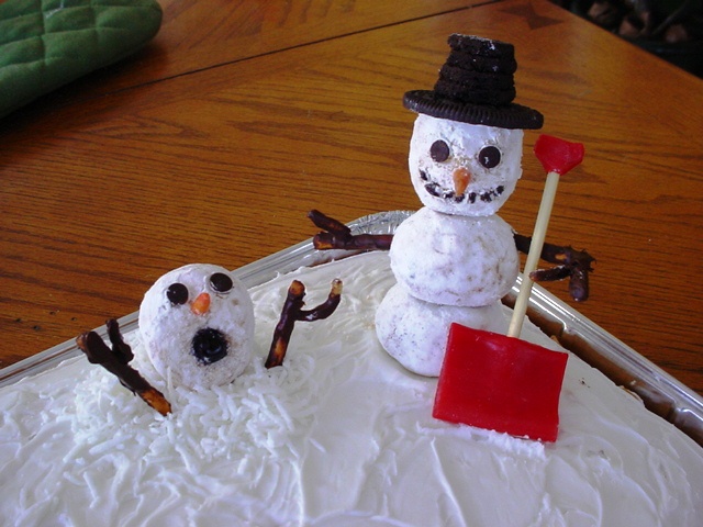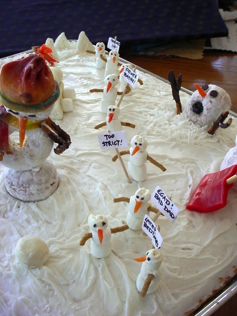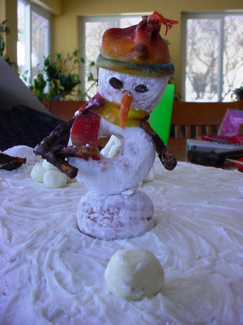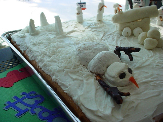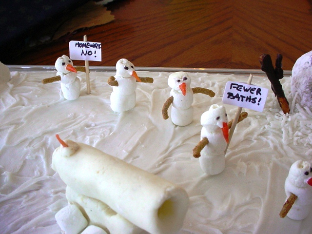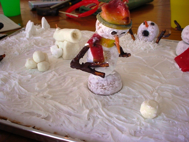 Three of my troop’s girl scouts did a fundraiser for literacy by hosting an “Edible Book” feast. People who entered created something edible based on a favorite book. Mine was based on Calvin and Hobbes and the book Attack of the Deranged Mutant Killer Monster Snow Goons. The guy above buried his friend…