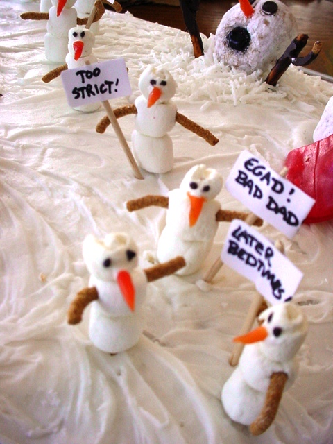 These little ones march around the cake protesting against Calvin’s dad’s rules.