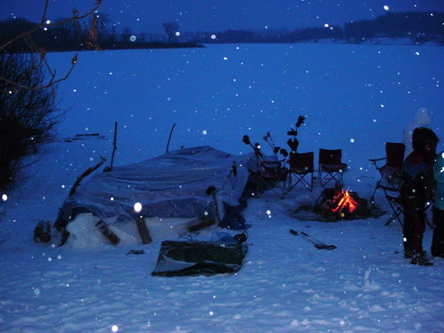 The camp chairs circled the fire ring and snow flurried down all day and into the night as the girls cooked hotdogs and made dough boys, sledded and built moguls, cooked pie iron pizzas, grilled cheese and fruit pies, gathered firewood, and set up pads and sleeping bags in the little snow rooms. I stuck a big branchy limb in the snow near the shelter and all the wet mittens ended up there, like a bizarre fingery tree. “Disaster” (named for a firewood sled crash) said it looked “Seussical”. Camper “Doughgirl”,(loves doughboys) our main block maker, is not a camper as a rule, but braved Camp Alaska anyway. She wavered between being her usual giggly self, and occasionally succumbing to the cold and weariness. At one point she sat by the fire next to her tarped shelter and harrumphed, “I feel like a HOBO.” :0D