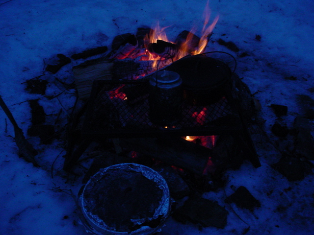 “Fluffy” made some glorious monkey bread that we baked in a dutch oven with embers on the lid, and I made “stone soup” with the contributions of each camper in another dutch oven on the fire. We kept the chai, cocoa and coffee flowing, but by 9pm, every one of us was starting to think about crawling into our warm cocoons. We were all damp — the worst enemy of the winter camper — but Bliz is a sled dog musher, and happened to have extra balaklavas, high tech long johns and enough wool socks so that everybody crawled into a mummy bag with dry clothes and warm feet. We found a lot of interesting places to put our handwarmers: they became foot warmers, butt warmers, head warmers and nose warmers as well.