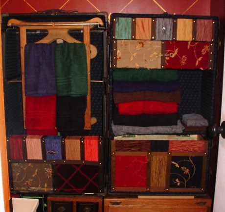 Well, mostly done. I want to find those little brass library drawer window-thingies and label which drawers containe liniments and pomades, and which contain remedies and tinctures. And we nneed to resolve the series of boxes and such supporting the trunk… but I got towels to go with the colors of the drawers, and hung them. This trunk was once a steamer trunk for traveling that would stand up on end and become a closet with hangers and drawers upon arrival. In my case it’s a fixture in our retro-steampunky bathroom… I also finished the trim on some woodwork and Jeff put in a copper pipe shower rod. We’re on our way, but taking it one project at a time…