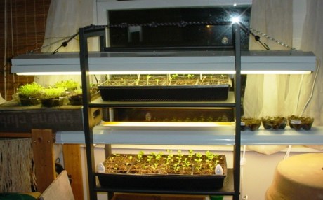 The plant lights are kind of cobbled from a bookshelf, shop lights and bungee cords. They make me happy.