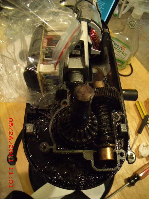 I called around until I found a place called Mr. Appliance in South Toledo. I picked up the boys after final exams and then headed down there, with my parts list, model number and the greasy worm gear in a bag. I decided to spring for a new gasket for the gear box as well, as the existing one had obviously allowed grease to ooze out around the edges. And for ten bucks I got a styro cup full of the special food grade grease used in kitchenaids. The shop was a fobot maker’s dream — parts for everything you could imagine. The whole bill was fifty bucks — a fraction of the three hundred plus it would cost to buy a new one.