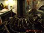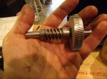 See the horizontal worm gear on the right? The one with the coppery looking end? That lifts right out. The dome shaped one to its left, though, is held in place by a little clamp ring. Not sure what it’s called but I made up several unkind names for it as I tap-tap-tapped it upward one skillimeter at a time.