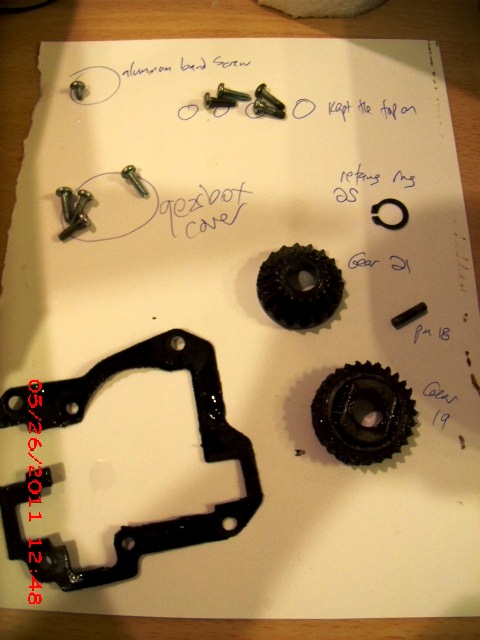 When you remove all those upright gears, you can make the whole bottom piece drop out (it’s called the planetary, which I consider kind of cool.) As I removed parts, I put them on a sheet of paper and wrote next to them where they came from. That’s picture six. I have a short attention span and have become really good at adapting to my non-linear way of thinking.