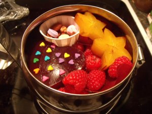 I made fruit leather and cut it into hearts for the kids… ditto for gelatin fruit juice “jigglers”… tucked in raspberries, almonds and chocolates, bright slices of starfruit, candy hearts with words on them.