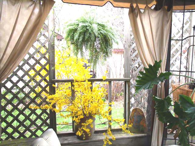 Somebody asked about my headboard… about a dozen years ago we put picket fence around all the back yard gardens, and I used this leftover piece to make the headboard for our bedroom. We have a big slider door that looks out at the back yard and I wanted the bedroom to seem like an extension of the outside. We put up a screened gazebo on the deck so we can walk out in nice weather, even maybe have coffee out there in our jammies. With that in mind, I put up a clothesline inside the screen house frame and hung curtains. Disclaimer: my room is a mess. In order to take this picture I threw all the mess to the back of the room and stood in the pile to take the picture. I can’t be expected to CLEAN MY HOUSE, you know. I am WAY too busy making odd decorating projects, lol.