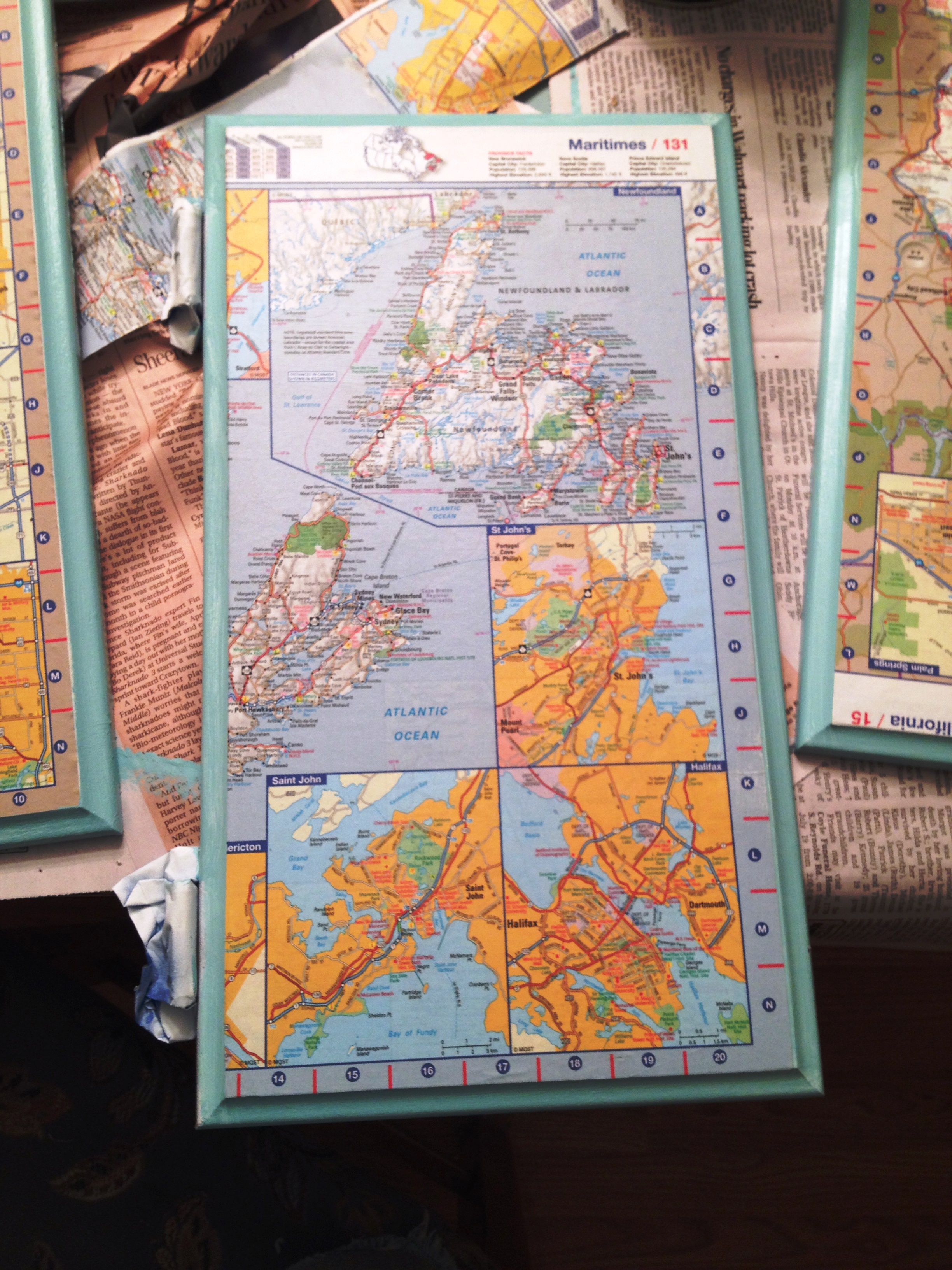 OK so it’s midnight and it’s possible that I am obsessing a little, but I just finished all the maps and primered the part of the pop-up I intend to paint. How lucky is it that the falling-apart Rand McNally atlas pages Jeff gave me are the EXACT SIZE of the inset on some of the cupboard doors? I lined them up so at least the bottom edge and one side got the ABC-123 grid numbers for a border. On a couple of wider ones I used a full page and then a strip of “city detail inset” maps to fill the gap. The smaller ones were easily cut down.