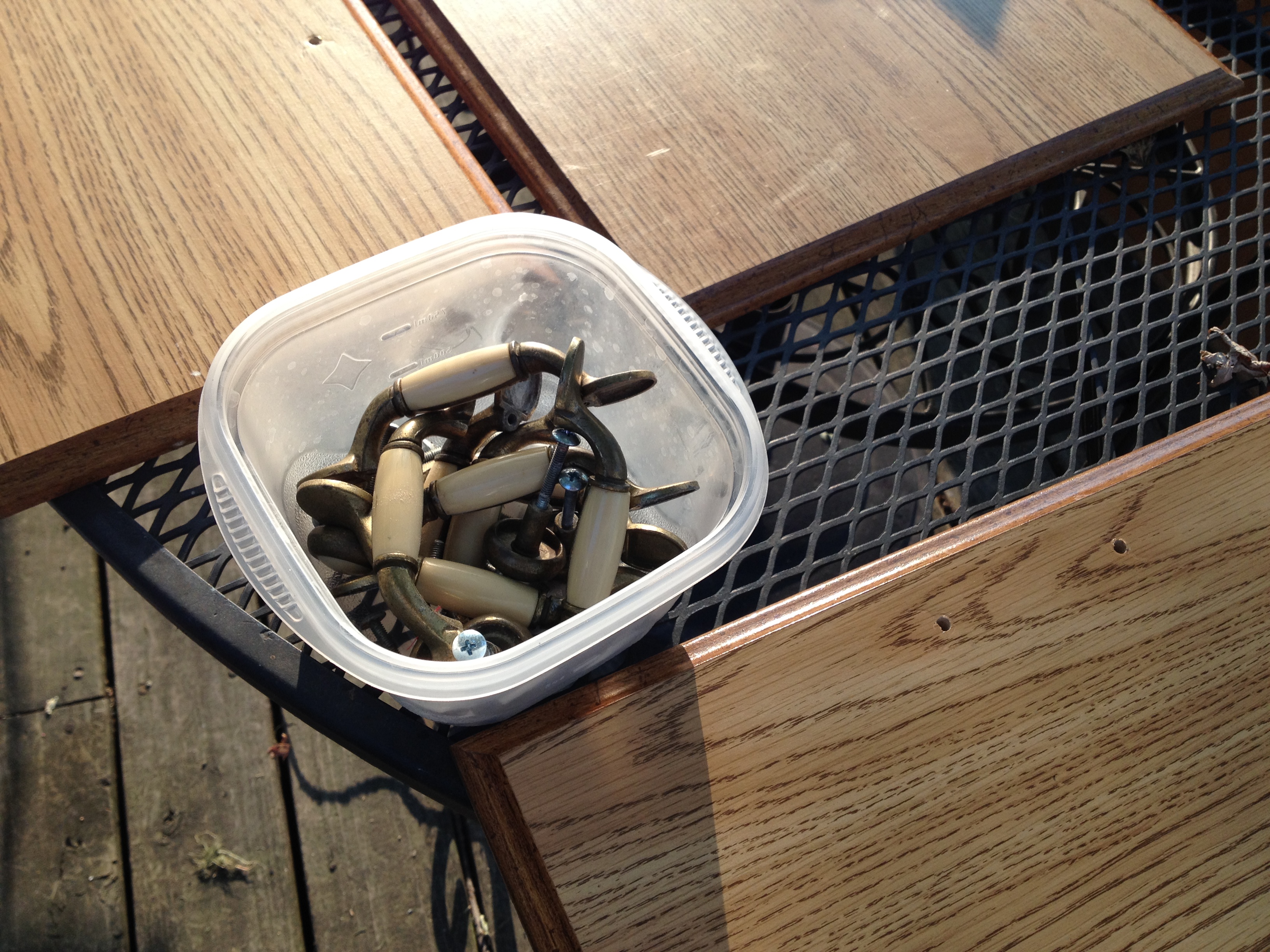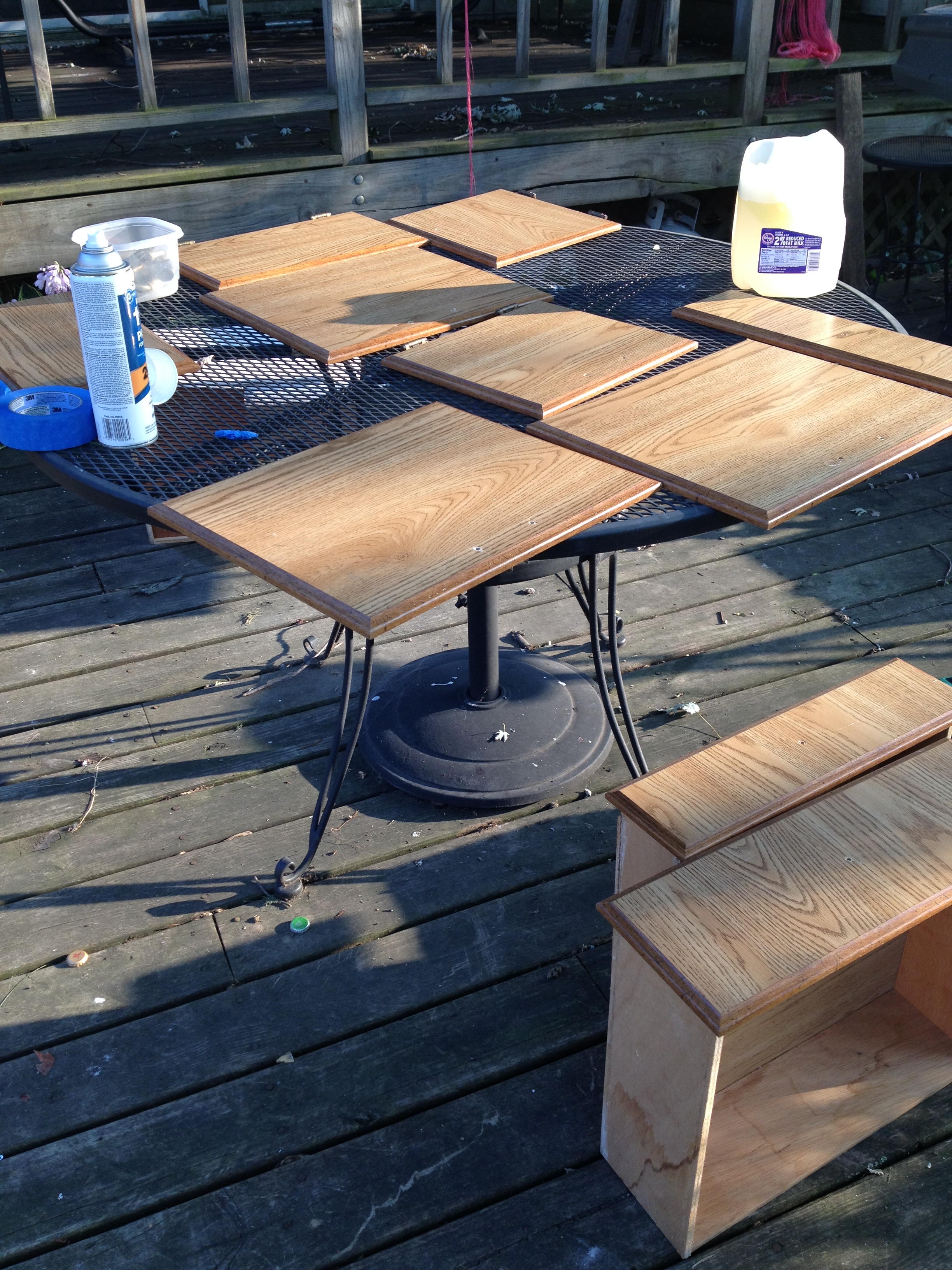 A blogger on the interwebs recommended a TSP type cleaner (I got phosphate free) and Zinnser primer. I got both. I used rubber gloves and a sponge to wash down the cupboard and drawer fronts, and the empty supports inside the pop uptact paper on metal. (a mix of laminate on particle board, laminate on plywood, and contact paper on metal.. The can of primer just barely made it but I managed to spray all the cupboards and drawers on Saturday, and left them overnight to dry.