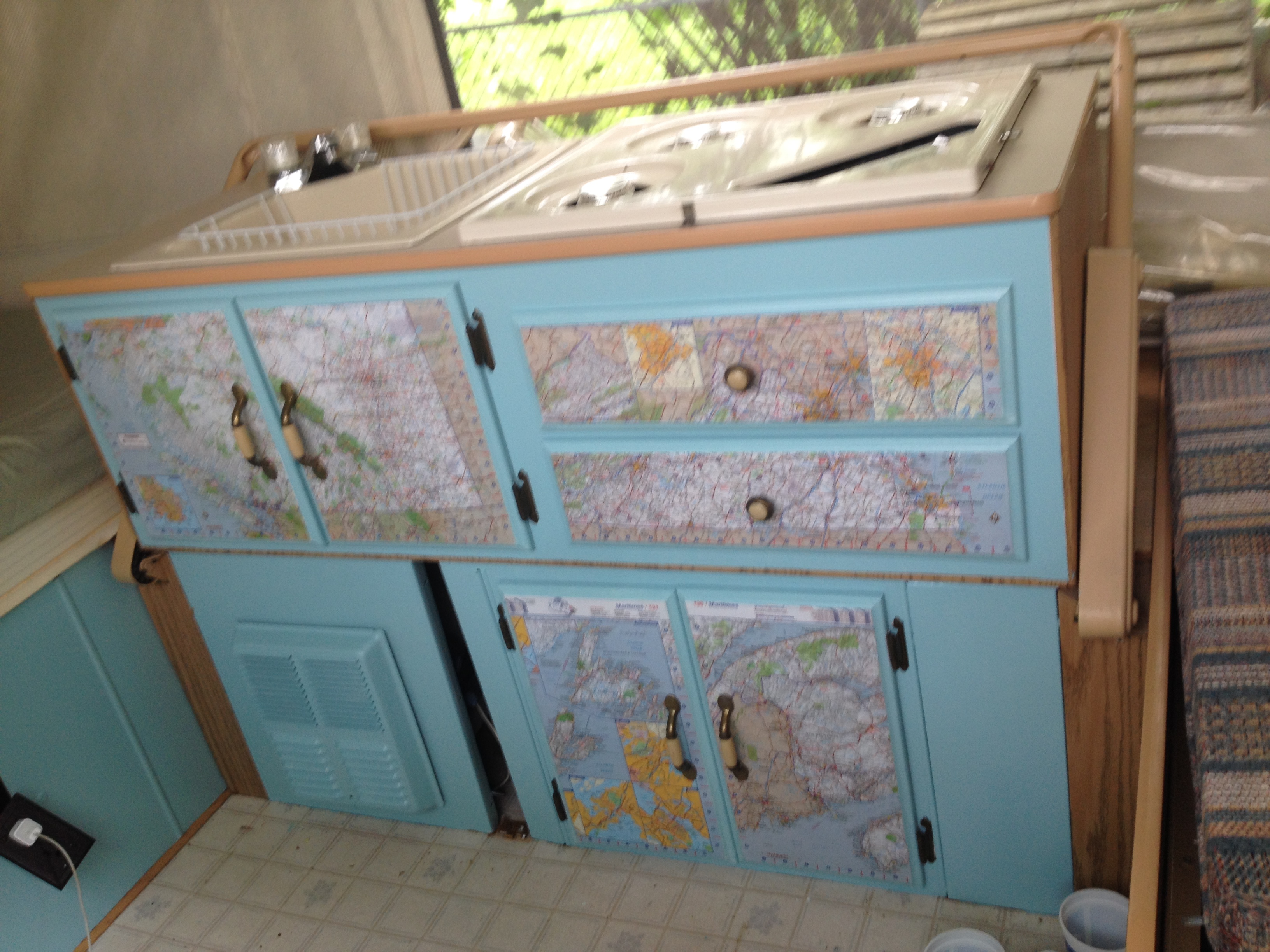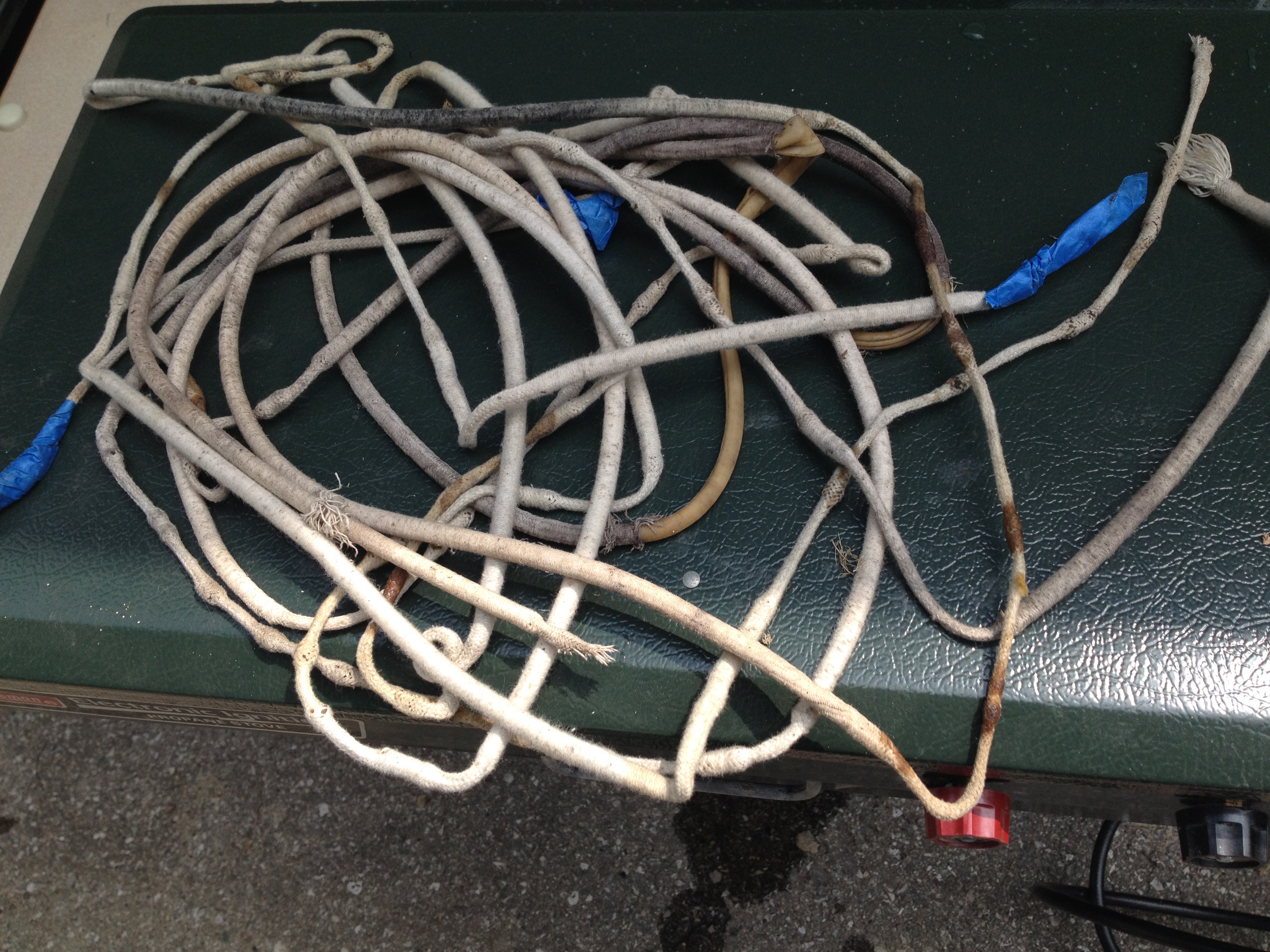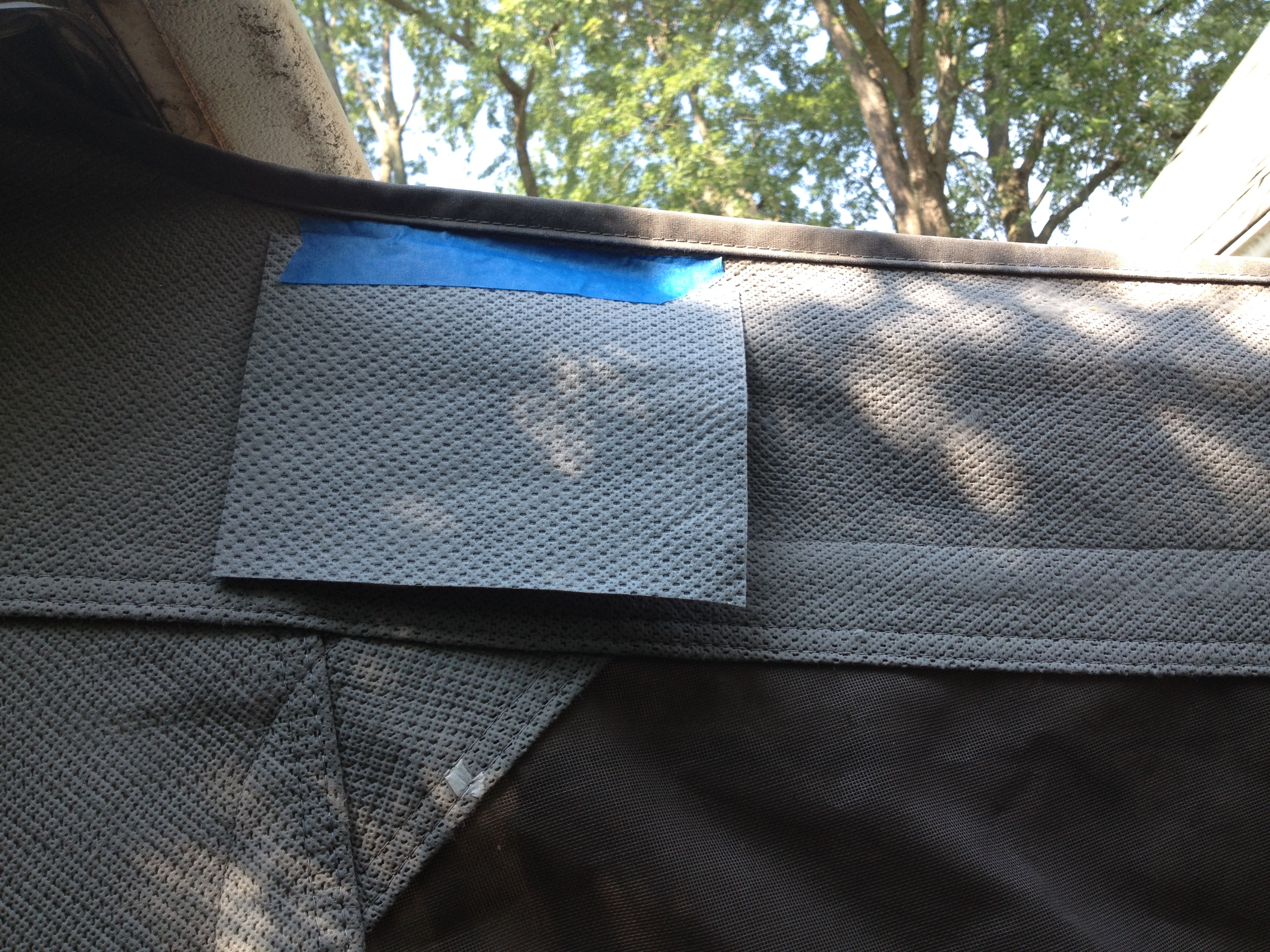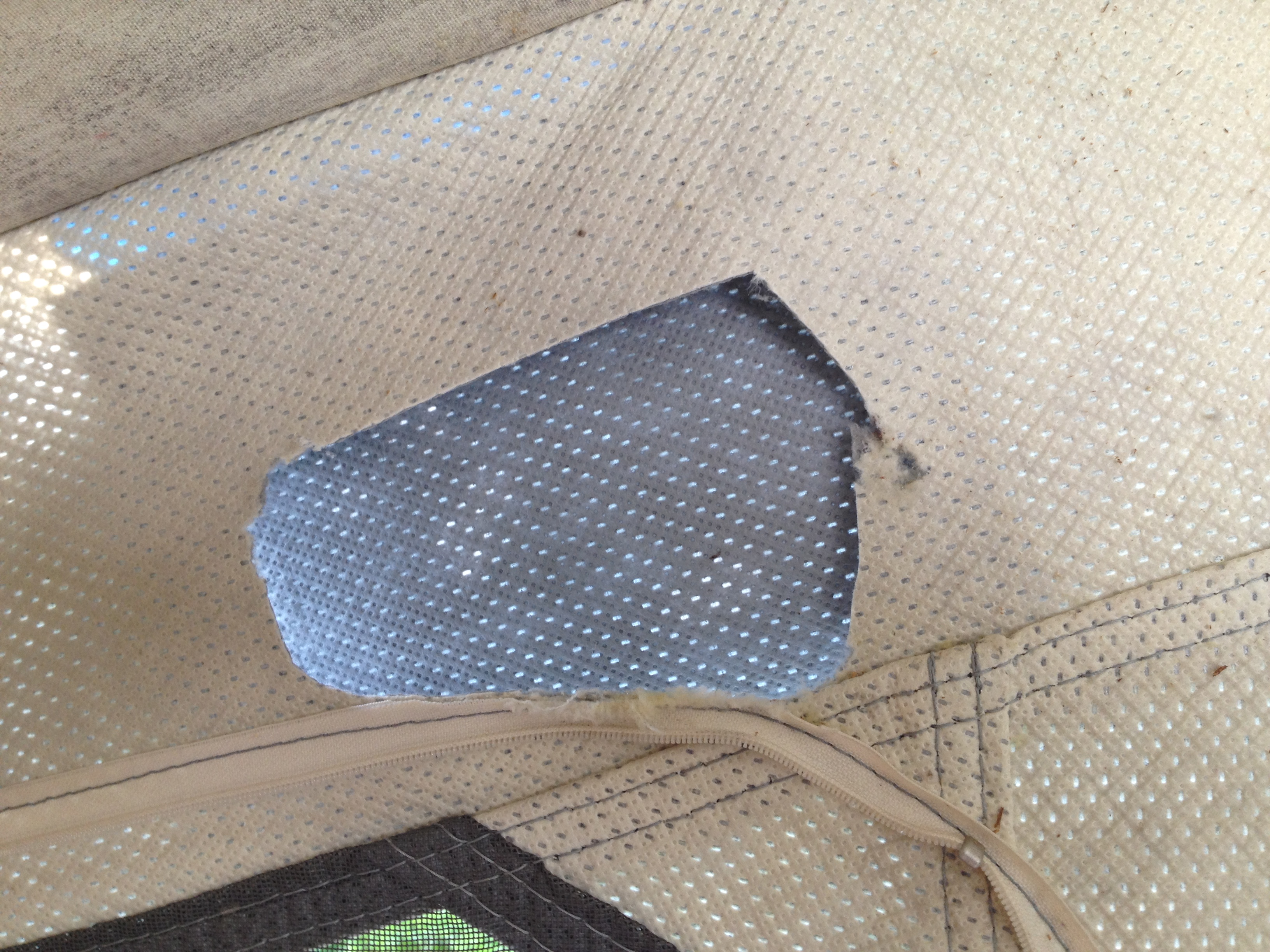 Mouse hole cut tidy, ready to stitch.Mouse hole patch secured on the outside (temporarily) with painter’s tape so I can sewThis mess was the ancient bungee cord that ran through the bottom edge of the canvas and secured the canvas ends under the slide-outs. Replaced it with nice new black stretchy cording.