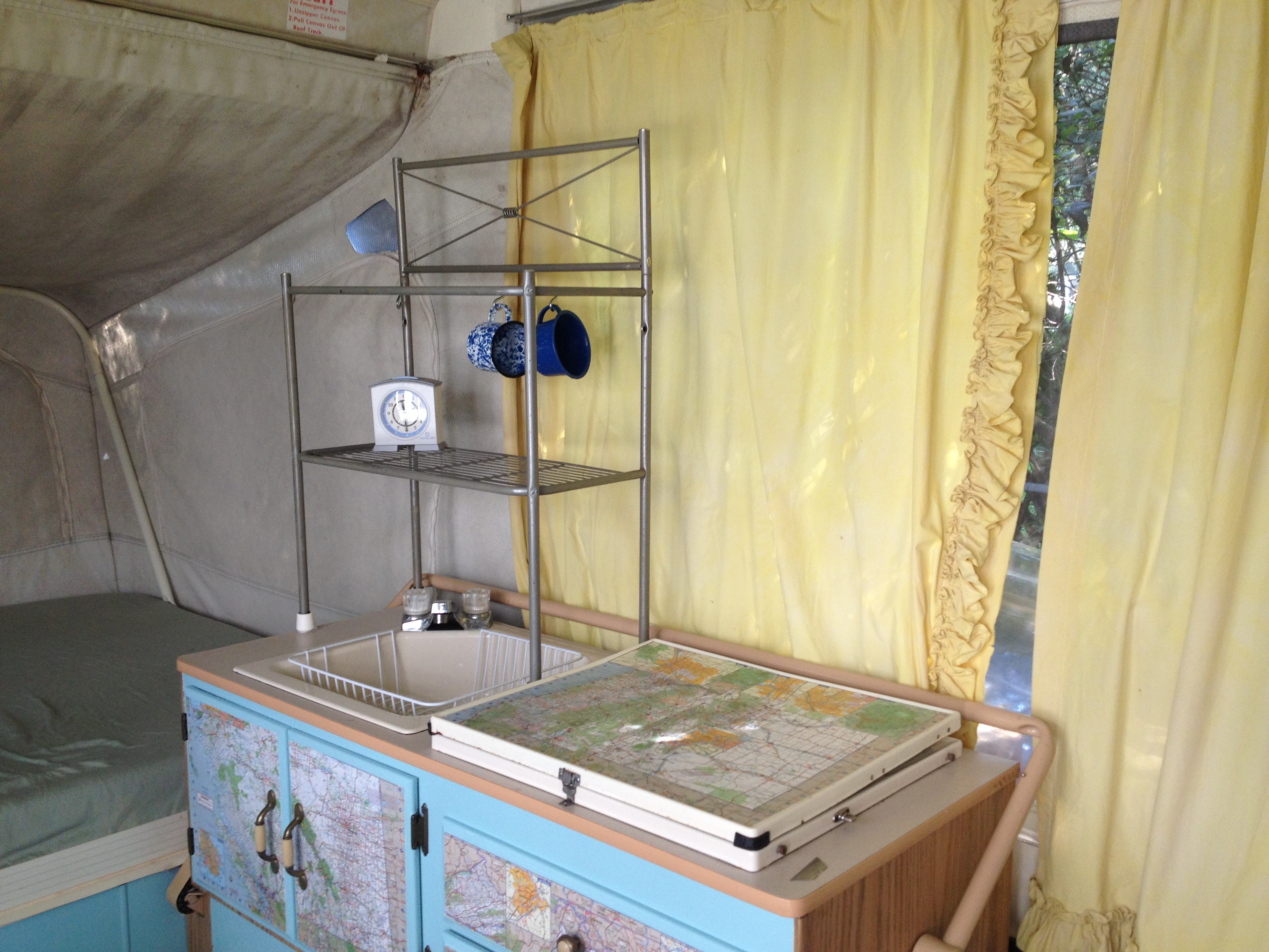 I had one of those tall shelf units meant to go over a toilet, for towels and such — and I had no real place for it. When I looked at it closely, it had come in a short box and the legs had been assembled tent-pole-style and attached with screws. I took the top part off of the bottom part and voila, it was really shallow in depth and just the right height to go over my pop up sink for a toothbrush cup, makeup mirror, alarm clock, etc.
